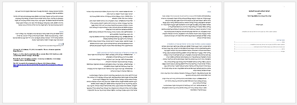 עבודה זו בוחנת את ההשפעה של תחום ה-ESG על העסקים הישראליים המקיימים קשרים עם חברות בינלאומיות, תוך התייחסות לאתגרים וליתרונות הקיימים ביישום פרקטיקות אלו. העבודה מתמקדת בסוגי החברות הפועלות בזירה הבינלאומית, בדרישות הגלובליות העומדות בפניהן, ובצעדים שננקטים בישראל על מנת להיערך לעידן עסקי חדש המושתת על קיימות, שקיפות ואחריות חברתית.
