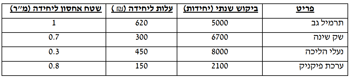מוכרת. להלן נתונים על הפריטים השונים (הניחו שבמחסן מחזיקים רק את הפריטים הללו).